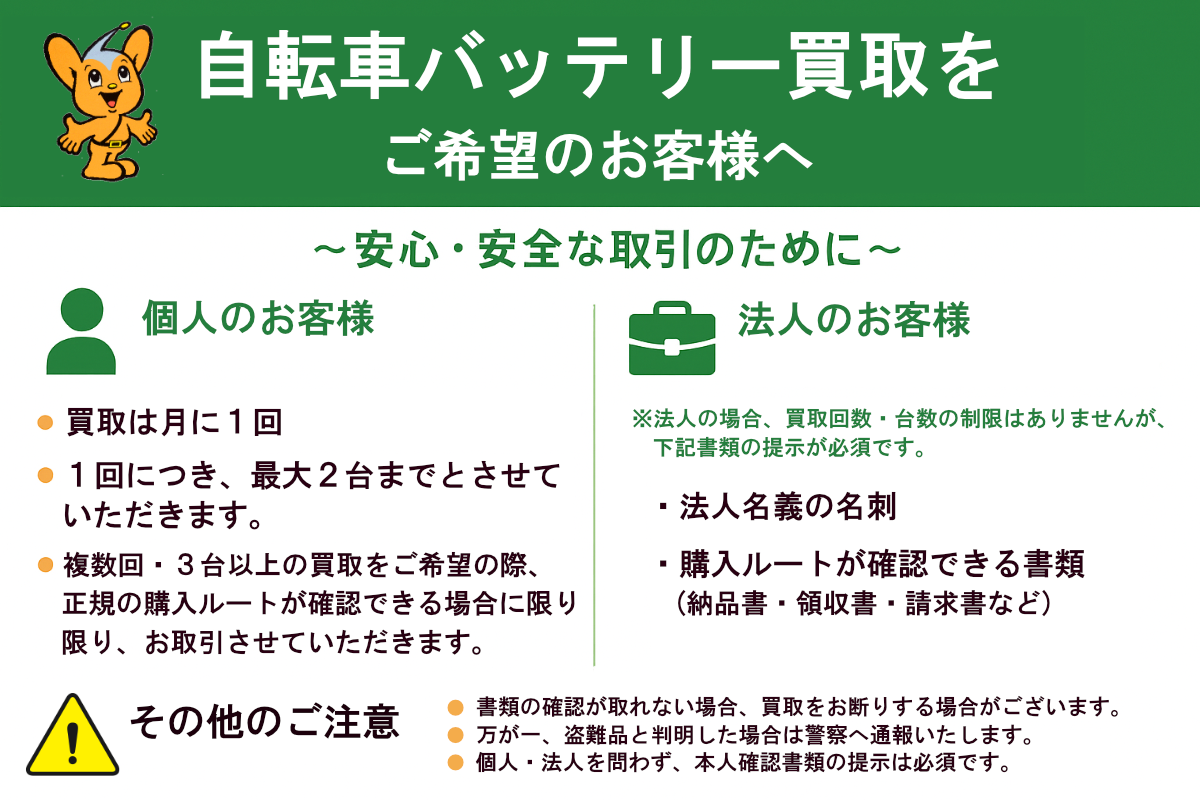 当店では、自転車バッテリー盗難品の流通防止および健全な取引のため、以下の条件に基づき自転車バッテリーの買取を行っております。